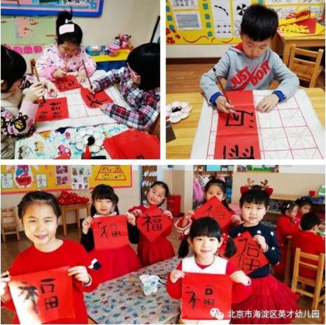 手工活动如火如荼的进行中,小朋友的热情十分高涨。写福字、剪窗花、写对联、画灯笼、做游戏,玩的不亦乐乎。